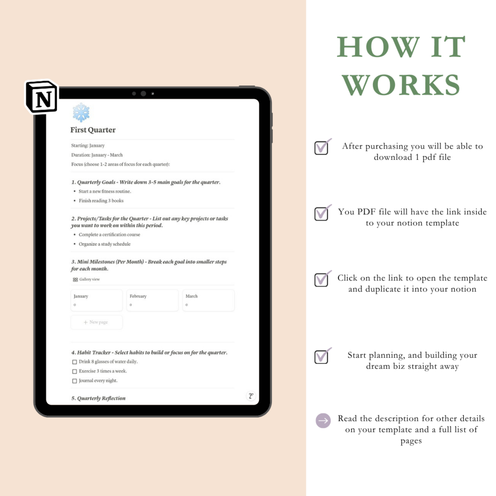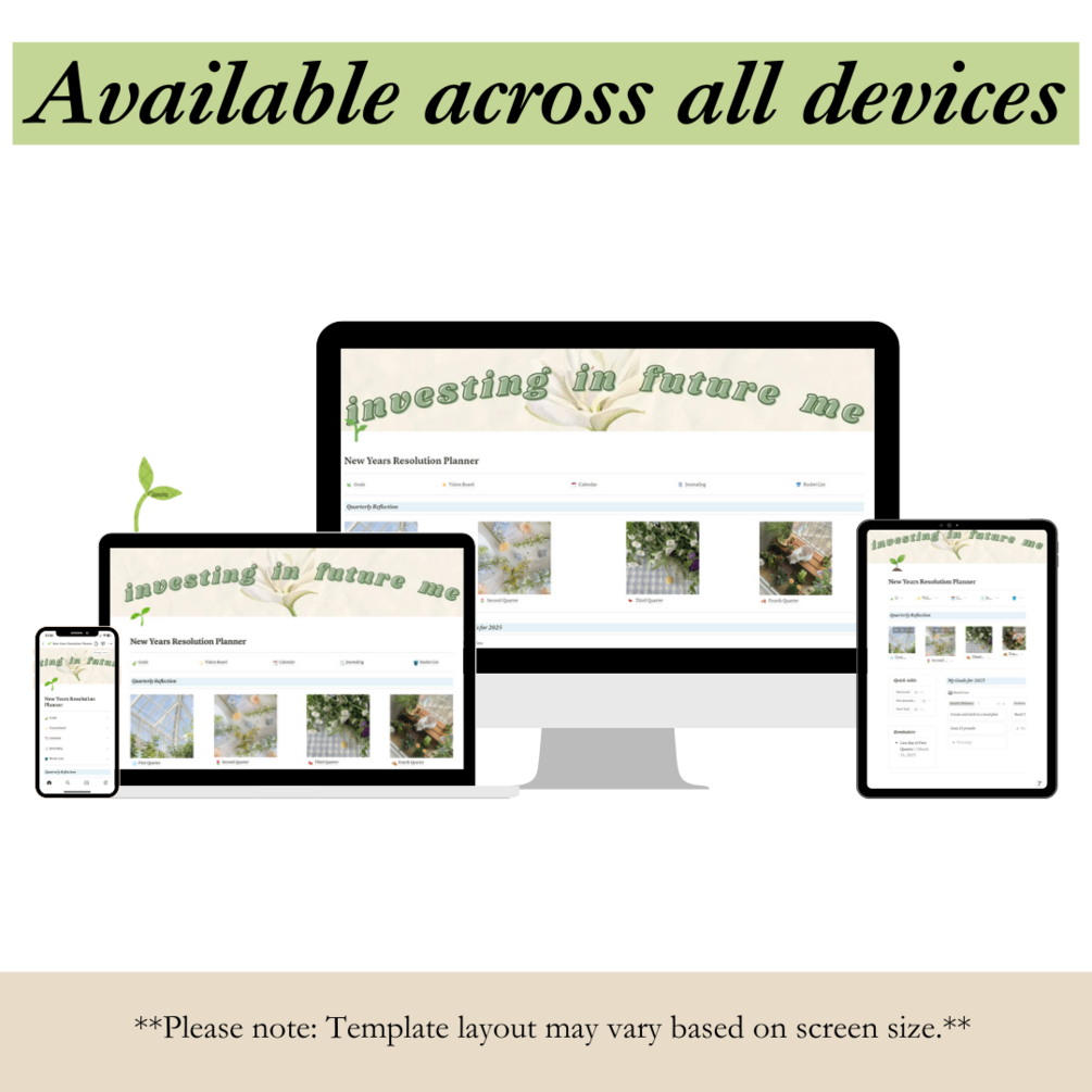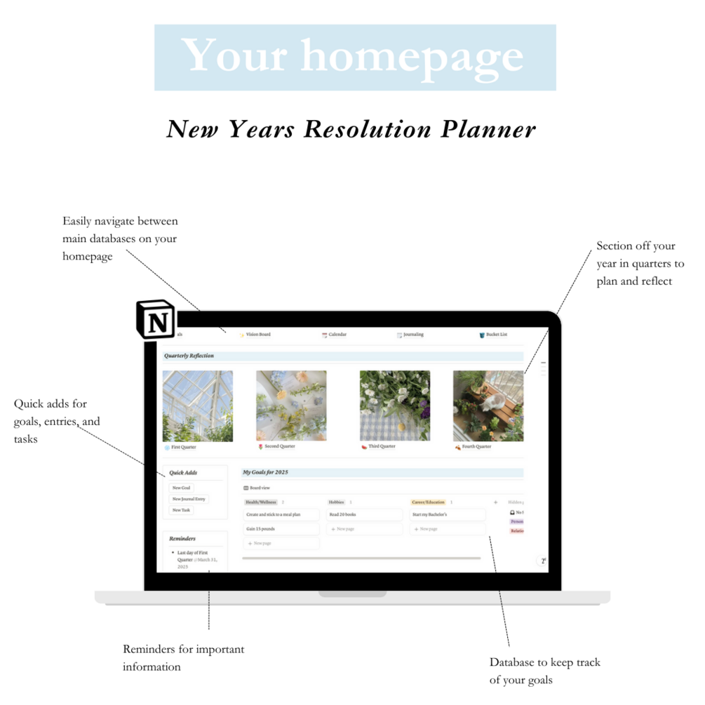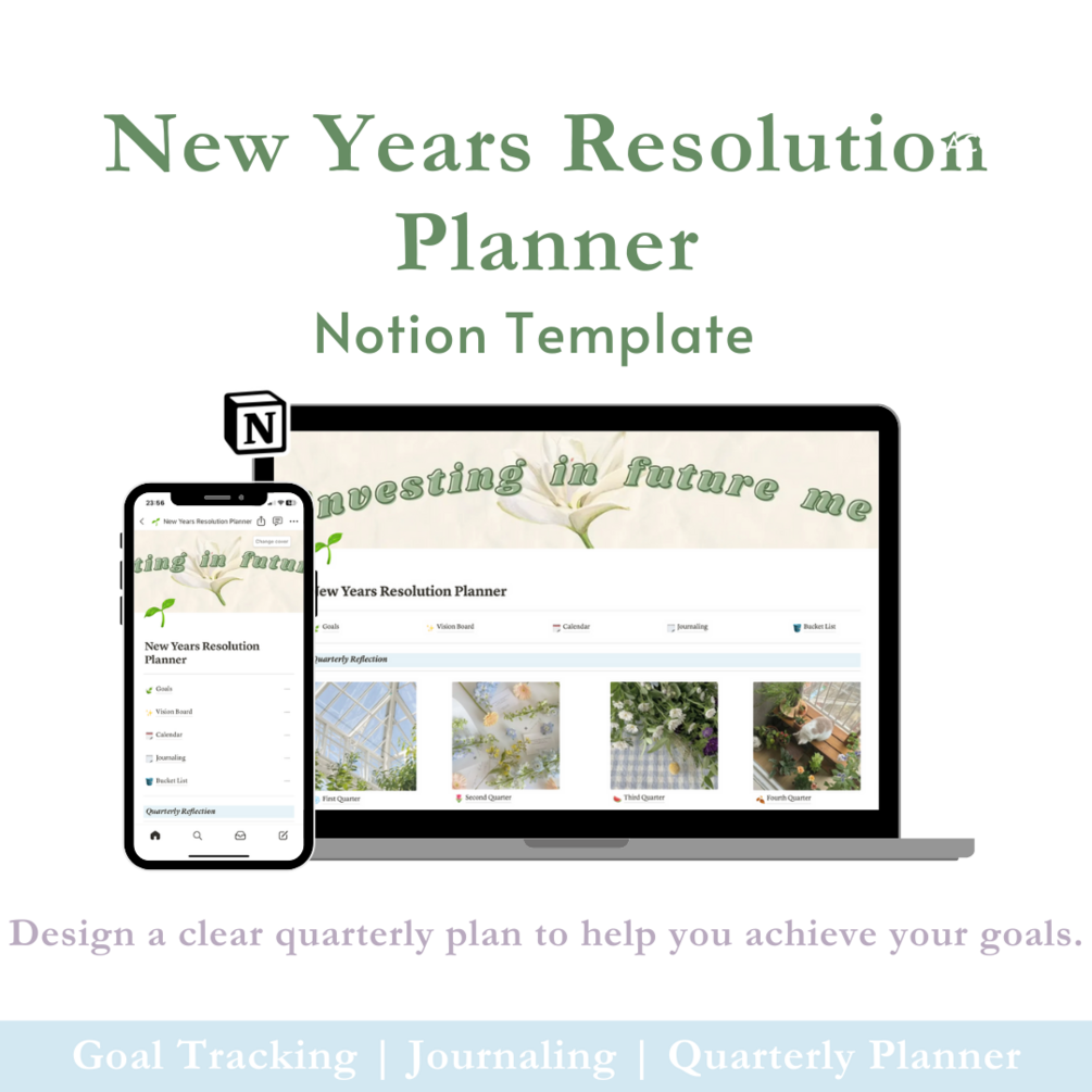 Kickstart your year with a planner designed to help you achieve your goals, stay focused, and reflect on your progress. This all-in-one Notion template is perfect for anyone looking to stay organized and intentional throughout the year.