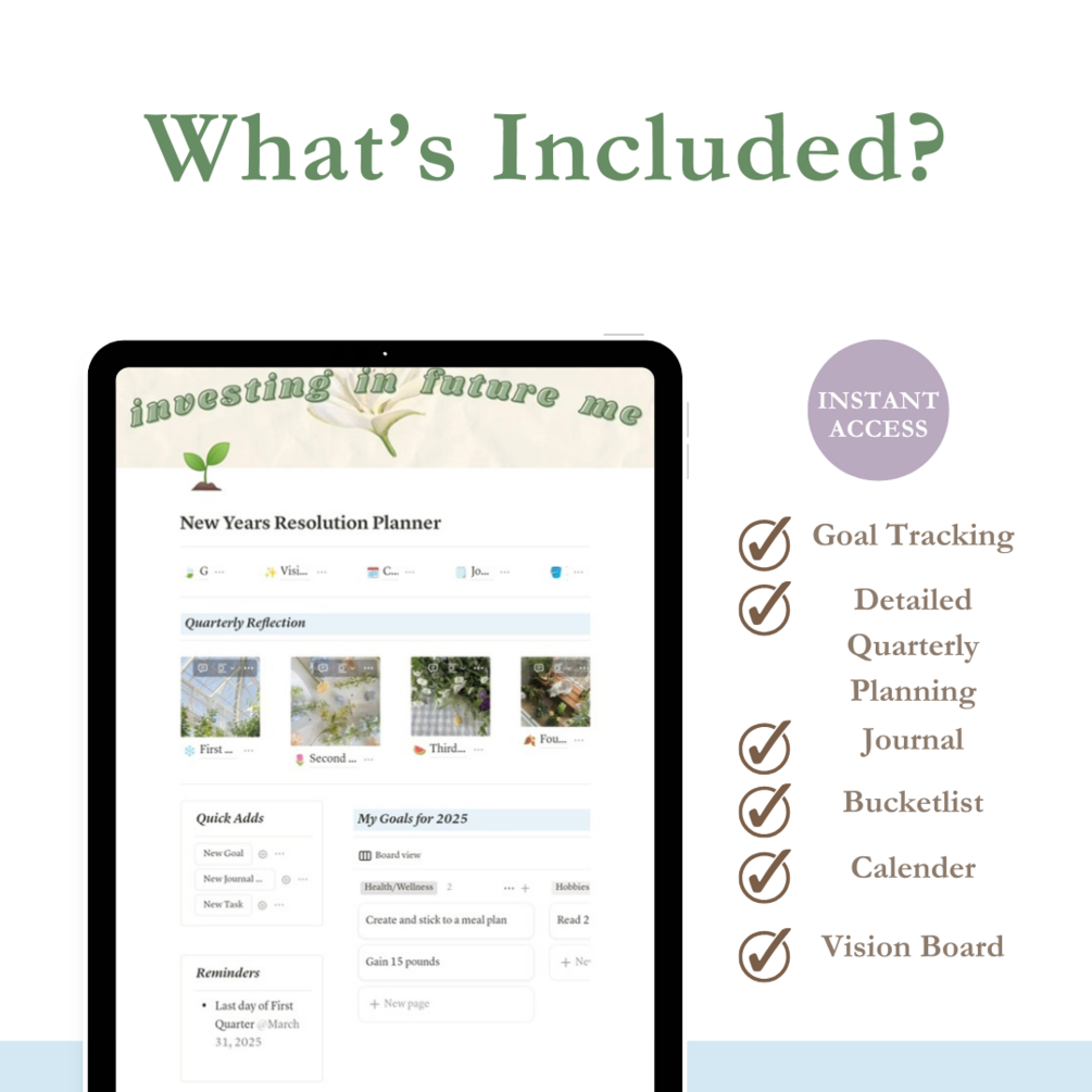 With its clean, functional design and powerful tools, the New Year’s Resolution Planner simplifies goal setting and quarterly planning, so you can focus on what matters most—achieving your dreams.