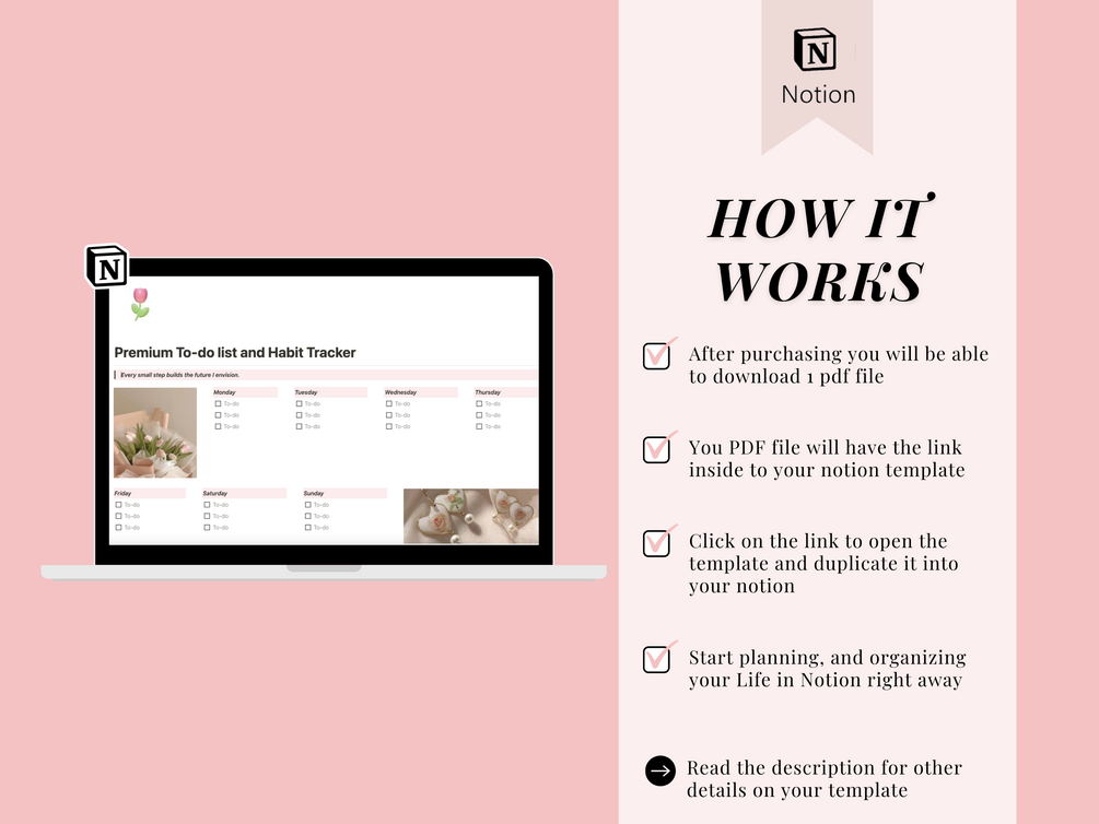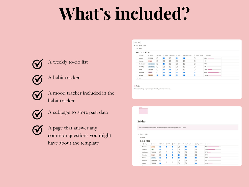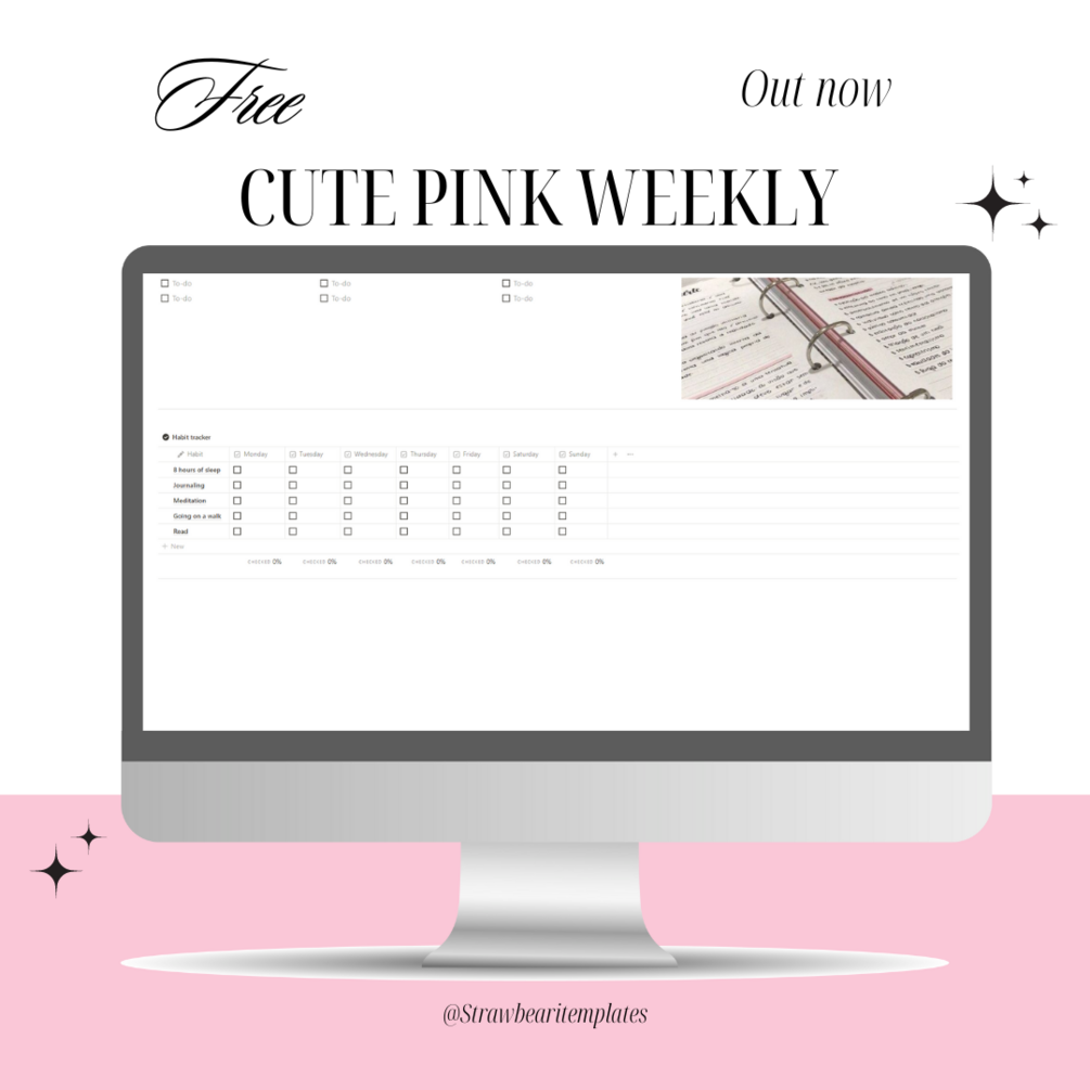 Stay Organized: Simplify your week with a clear and concise layout, helping you to manage your tasks and habits effectively. Boost Productivity: Visualize your progress and stay motivated with the percentage completion feature, encouraging you to reach your goals. Enjoy Planning: With its cute and pink aesthetic, planning becomes a delightful part of your daily routine.