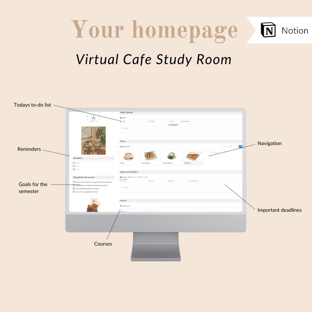 Welcome to your cozy café-inspired study space! This Notion template is designed to help students create a productive and focused atmosphere that feels like working from your favourite café. Whether you're planning study sessions, tackling assignments, or managing projects, this template has everything you need to stay organized and motivated.